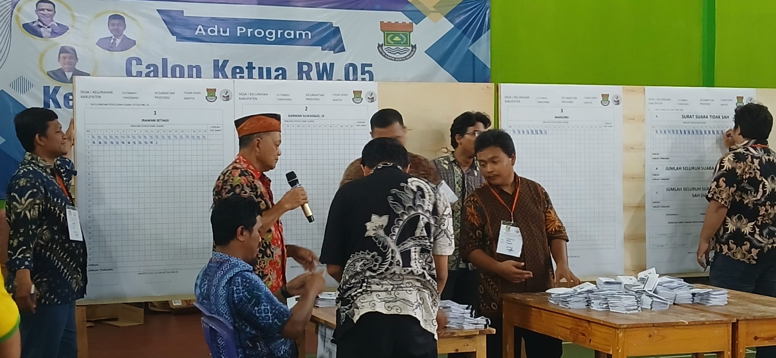 Perhitungan surat suara dilaksanakan di Balai Warga RW 05 sekitar pukul 13.00 WIB, disaksikan oleh ketiga kandidat calon RW 05 dan masyarakat.