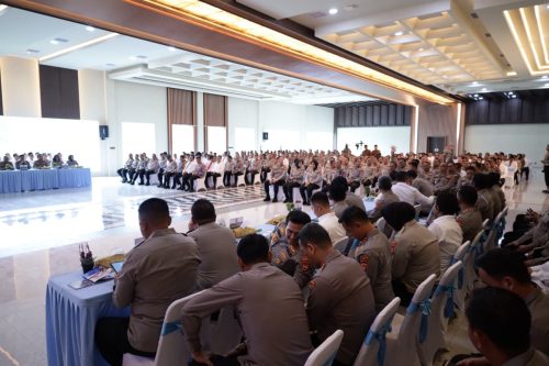 Suasana rapat pimpinan (rapim) Polda Banten tahun 2026 yang diikuti jajaran pejabat utama, kapolres, hingga kapolsek sebagai bentuk konsolidasi dan penguatan kinerja menuju Banten aman dan kondusif.