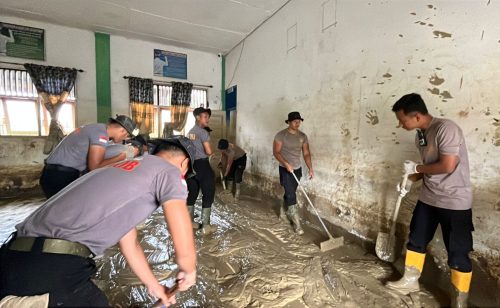 Komandan Kompi Penugasan, Kompol Zhia Ul Archam, menyampaikan bahwa pihaknya bersama tim gabungan fokus membersihkan sisa lumpur dan sampah yang masih menumpuk di area sekolah.