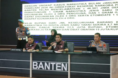 Pengungkapan kasus ini disampaikan dalam konferensi pers yang digelar di Aula Serbaguna Polda Banten, Kamis (26/02/2026). Kegiatan dipimpin Dirresnarkoba Kombes Pol. Wiwin Setiawan, didampingi Kabid Humas Kombes Pol. Maruli Ahiles Hutapea serta Wadirresnarkoba AKBP Suyono.