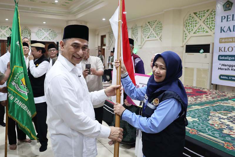 Pelepasan dilakukan secara simbolis melalui penyerahan bendera petaka Kementerian Agama dan Kabupaten Tangerang kepada Petugas Haji Daerah (PHD).