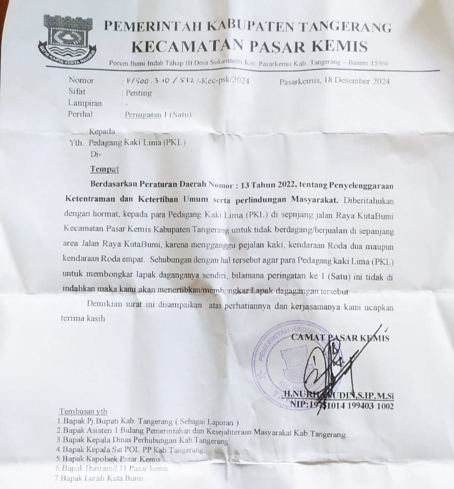 Dalam surat edarannya yang telah dibagikan kepada para pedagang dengan nomor: P/500.310/512/Kec-psk/2024 tertanggal 18 Desember 2024 Camat Pasar Kemis memberikan Peringatan 1 (satu) kepada pedagang kaki lima untuk tidak berdagang/berjualan di sepanjang area Jalan Raya Kutabumi karena mengganggu pejalan kaki, kendaraan roda dua maupun kendaraan roda empat.