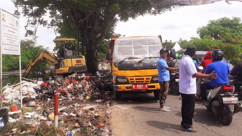 Camat Pasar Kemis H.Nurhanudin bersama Dinas Lingkungan Hidup UPT 7 bersama -sama membersihkan sampah yang menumpuk dan berterakan di pinggir jalan Raya Cadas – Kukun.