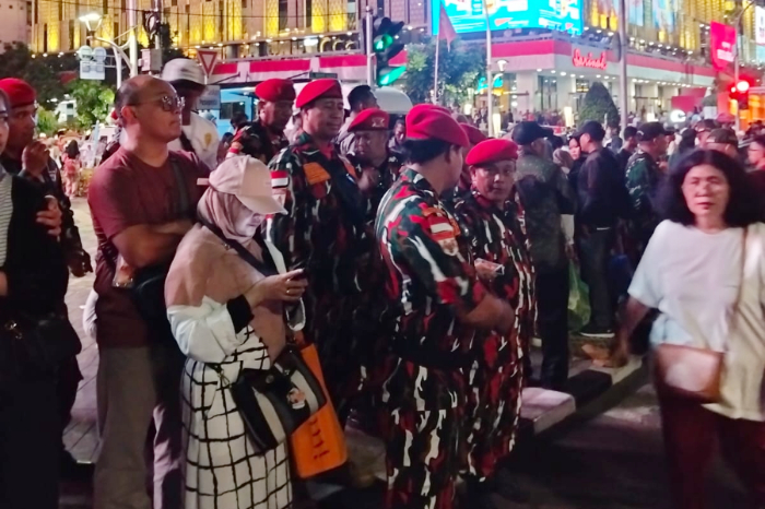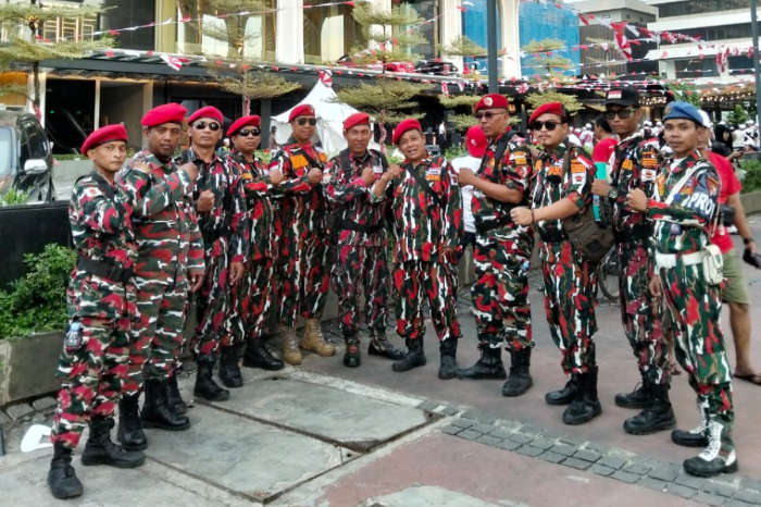 Pasukan Laskar Merah Putih bersama APH melakukan pengamanan HUT ke-80 Kemerdekaan RI di Perempatan Sarinah Thamrin Jakarta. (Foto: Asmara'65/Metrosiar)