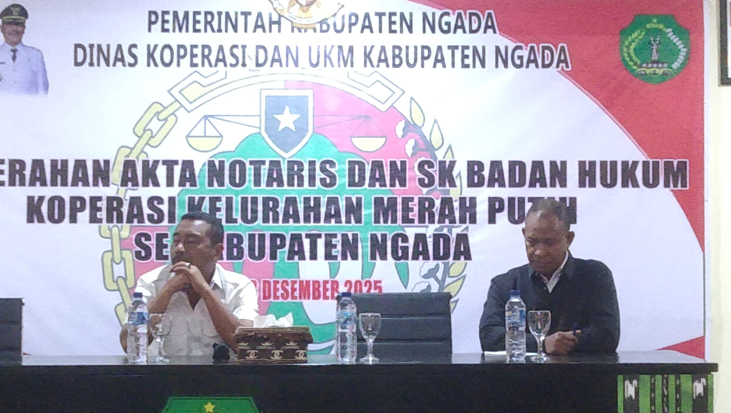 Hadir dalam kesempatan itu, para Notaris, Kepala Dinas Koperasi dan UKM Ngada, Kepala Dinas Pemberdayaan Masyarakat dan Desa, Kepala Dinas Peternakan Ngada, para Camat dan seluruh pengurus serta pengawas koperasi kelurahan merah putih se-Kabupaten Ngada.